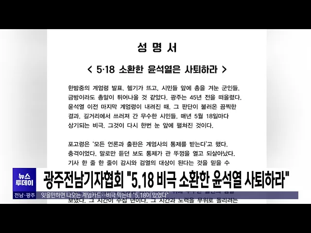 광주전남기자협회는이번 비상계엄 선포와 관련해오늘(4일) 오후 성명서를 내고, 윤석열 대통령의 사퇴를 촉구했습니다.기자협회는 "5월 18일마다 상기되는 비극이눈 앞에 다시 펼쳐졌다"며,"계엄령 시도는 실패했지만,언론의 자유를 빼앗으려는 시도는 단죄돼야 한다"고 밝혔습니다.그러면서 "광주·전남 지역에 트라우마를 ...