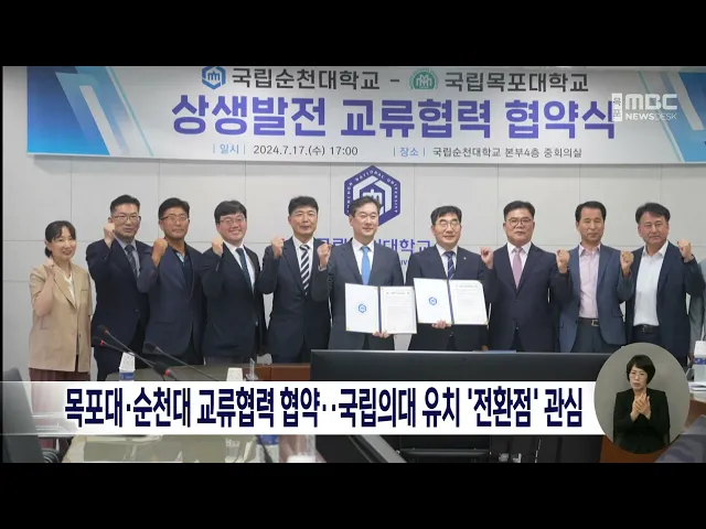 목포대와 순천대가 공식 교류협력 협약을 체결해 '전남국립의대 유치'와 관련한 영향에 관심이 모아지고 있습니다.오늘(17일) 순천대에서 열린 협약식에서 송하철 목포대 총장과 이병운 순천대 총장은 "양 대학의 현안을 공유하고, 지역의 공동발전 방안을 모색하기로 했다"고 밝혔습니다.목포대와 순천대의 협약은 글로컬 ...