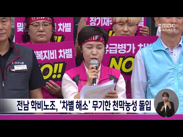 전국학교비정규직노동조합 전남지부가처우 개선을 요구하며 전남교육청 앞에서 무기한 천막 농성에 돌입했습니다.전국학비노조 전남지부는 정규직 대비 절반 수준에 그치는 임금 등학교비정규직에 대한 차별을 해소하기 위해작년부터 지금까지 총 109회 차례의 노사간 교섭을 진행했음에도 불구하고전남교육청은 답을 내놓...