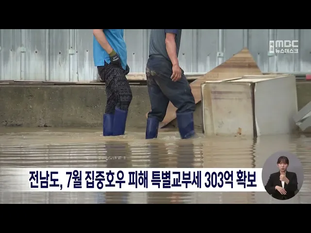 전라남도가 지난 7월 16일부터 닷새간 이어진 집중 호우 피해의 신속한 복구를 위해 행정안전부로부터 303억원 규모의 특별교부세를 확보했습니다.이번 집중호우로 전남에선 주택 400여동과 농경지 50여ha,하천 430개소 등 시설피해가 발생해1천 46억 원에 달하는 피해가발생한 것으로 조사됐습니다.전남도는 이번 특별교부...