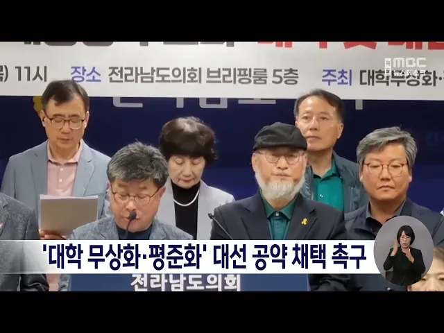 대학 무상화‧평준화 전남운동본부와시민사회 단체가 오늘(29) 전남도의회에서 기자회견을 갖고대학 및 대입제도 개혁을 대선 공약으로반영할 것을 건의했습니다.이들 단체들은"대학입시의 극심한 경쟁체제 속에서교육은 신음하고 있다"며대학 서열 체제 해소와 입시 경쟁 교육 해소,고등교육 공공성 강화 및 대학 무상화는...
