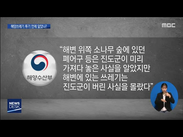 ◀ANC▶ 지난 20일, 국제 연안정화의 날 행사 전날, 진도군이 해변에 해양쓰레기를 투기했다는 MBC 보도 이후 해양수산부장관과 진도군수가 사과했는데요.. 진도군이 해양쓰레기를 몰래 버린 사실을 해양수산부도 행사 전에 이미 알았던 것으로 확인됐습니다. 김양훈 기자가 취재했습니다. ◀END▶ 진도군이 진도 가계해...