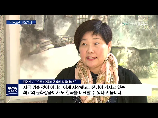 ◀ANC▶ 제1회 2018 전남 국제수묵비엔날레가 예술성과 대중성을 잡고 성공리에 끝났지만 제2회 대회를 겨냥한 후속 노력이 아쉽습니다. 지역 경제와 산업에 뿌리를 내리기 위한 자구 노력이 준비돼야 한다는 지적입니다. 장용기 기자 ◀END▶ -------------------------------- 목포와 진도에서 두달에 걸쳐 집중적으로 ...