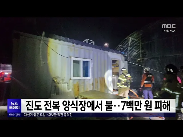 어젯밤(13) 11시 20분쯤진도군 고군면의 전복 양식장에서 불이 나비닐하우스 1동 등을 태우고10여 분 만에 꺼졌습니다.경찰과 소방 당국은 양식장 내 분전반에서 전기적 요인으로 불이 시작된 것으로 보고정확한 화재 원인을 조사하고 있습니다.
