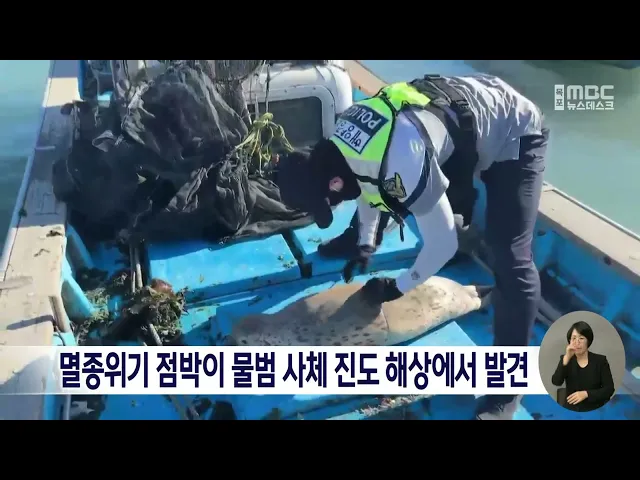 진도 해상에서 천연기념물 점박이 물범 사체가 발견됐습니다.목포해양경찰서는 오늘(4) 오후 2시 30분쯤진도군 군내면 인근 해상에서 조업하던 어선 어망에 점박이 물범 사체가 혼획됐다는 신고를 접수해 국립수산과학원 고래연구센터에 인계했습니다.점박이 물범은 멸종위기 야생동물로, 천연기념물 제331호로 지정돼있습...