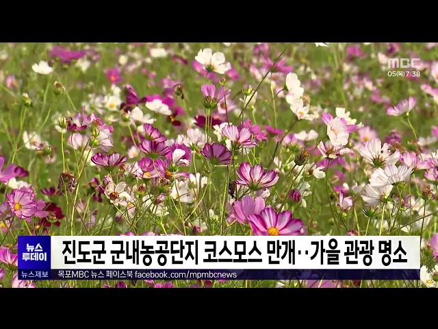 진도군이 군내농공단지 유휴지 8만2천5백㎡에 대규모로 조성한 코스모스가 일제히 꽃을 피워 가을 진도관광의 명소로 떠올랐습니다. 진도 군내 코스모스 체험장은 진도군이 코스모스 종자 2백kg을 파종해 조성한 곳으로, 진도전망대와 녹진 바다와 어우러져 장관을 이루고 있습니다. 진도군은 미분양상태인 농공단지를 관...