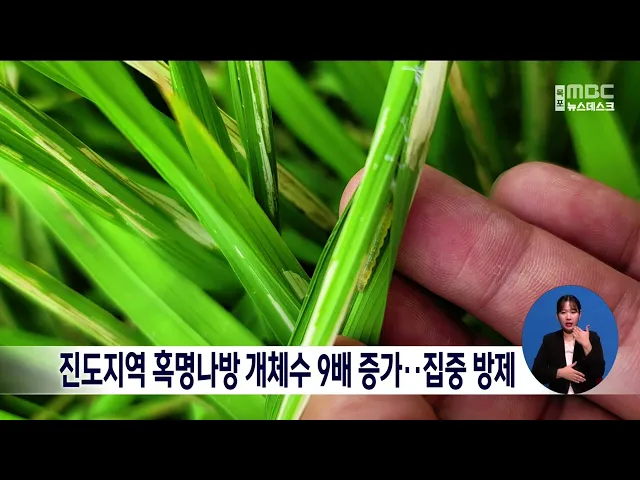 진도군은 최근 장마와 태풍 이후 높은 기온으로 벼논의 혹명나방 개체수가 9배 증가함에 따라 집중 방제에 나섭니다. 장마전선을 타고 중국에서 날아와 발생하는 것으로 알려진 혹명나방은 온도가 높고 비가 적을때 집중 번식하는 것으로 알려져 있으며, 진도군은 가루쌀 생산단지와 이모작 논 등이 특히 피해가 크다며 농...