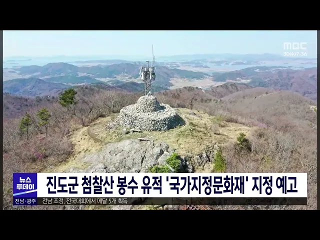'진도 첨찰산 봉수 유적'이 국가지정문화재 '사적'으로 지정 예고돼 오는 10월 고시될 예정입니다. 봉수 유적은 요새 기능에 중점을 둔 조선시대의 중요 군사·통신시설로서 조선왕조실록을 비롯한 각 문헌에 기록됐습니다. 첨찰산 봉수 유적 국가지정문화재 사적으로 지정되면, 용장성과 남도진성에 이어 진도군의 3번째 사...