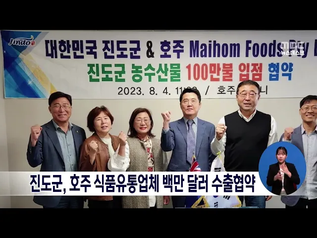 진도군은 호주 식품유통업체와 협약을 맺고, 진도수협 등 5개 지역업체 잡곡과 곱창김 등 백만달러어치를 수출하기로 했습니다. 이번 협약은 진도군이 호주 시장에 직접 진출하는 첫 사례인데 호주 시드니 현지 2개 유통업체가 진도식품 판촉행사를 진행하고 있어, 수출 규모는 더욱 커질 것으로 예상됩니다.