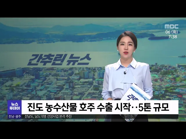 ◀ANC▶ 오늘의 간추린 뉴스입니다. 진도에서 생산된 꽃게와 곱창김, 젓갈류 등이 호주 시드니 등으로 첫 수출 됐습니다. 이번 수출은 진도군 농수산 유통사업단의 첫 수출실적으로 규모는 5톤이며 앞으로 호주 한인 마트 등으로 수출규모가 더욱 확대될 예정입니다. ------------ 신안군 도초에 조성된 평나무 10리길 '환...