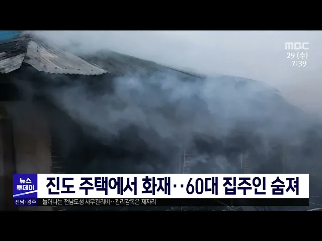 어제(28) 저녁 6시 15분쯤 진도군 의신면의 한 주택에서 불이나 출동한 119에 의해 2시간여 만에 진화됐지만 집주인인 60대 남성이 숨진 채 발견됐습니다. 진도소방서와 경찰은 목격자 등을 상대로 정확한 화재원인을 조사하고 있습니다.
