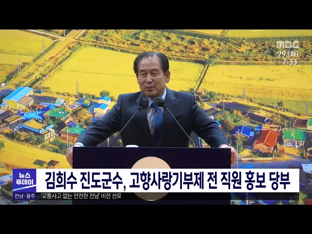 김희수 진도군수는 전직원을 대상으로 고향사랑기부제 관련 교육을 갖고, 공무원이 나서 홍보활동을 강화해 줄 것을 요청했습니다. 진도군은 고향사랑 기부제 답례품으로 울금과 미역 등 농수특산물을 비롯해 명량해상케이블카 이용권, 유람선, 제주항로 여객선 이용권 등을 선정하고, 심의위원회를 거쳐 최종 확정할 예정...