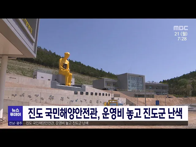 세월호 참사를 계기로 진도에 설립된 국민해양안전관 운영을 놓고 진도군의 고민이 커지고 있습니다. 진도군에 조성되는 국민해양안전관은 현재 마무리 공사가 진행 중이며 향후 시범운영을 거쳐 내년 7월 정식 개관할 예정이지만 연간 전체 운영비 25억 원 중 10억 원을 진도군이 부담해야 합니다. 하지만 진도군의회는 운...
