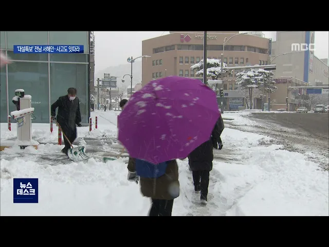 ◀ANC▶주말부터 서해안을 중심으로많은 양의 눈이 쏟아지면서 빙판길 사고가 잇따랐습니다.지자체들은 비상근무체제에 돌입해폭설과 강풍 피해예방에 나섰습니다.김안수 기자가 취재했습니다. ◀END▶새벽녘 빙판길로 변한 도로에제설차가 염화칼슘을 뿌립니다.주요 간선도로에서는지자체 공무원들이 나서 제설작업을 ...
