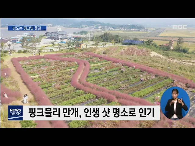 ◀ANC▶ 전남 함평 돌머리 해변은 드넓은 갯벌과 낙조를 보기위해 관광객들이 많이 몰리는 곳인데요 이 곳에 핑크뮬리와 코스모스 등 가을꽃이 만개해 추억 만들기 장소로 전국적인 유명세를 타고 있습니다. 문연철 기자 입니다. ◀END▶ ◀VCR▶ 파스텔 느낌의 핑크빛 물결이 가을 햇살에 반짝입니다. 바닷바람에 핑크...