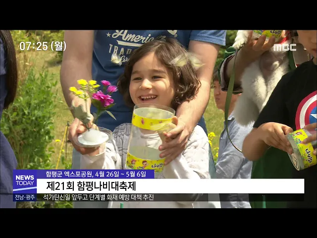 오늘의 간추린 소식입니다. 황금박쥐 조형물이 야외에 공개된 제21회 함평나비축제에 31만 명의 관람객이 다녀가고 입장료 수입이 9억5천5백만 원에 이르는 등 최근 10년 새 최고 흥행을 거둔 것으로 집계됐습니다. ========================================== 전남 5.18기념 문화제가 유공자와 유족, 도민들이 참석한 가...