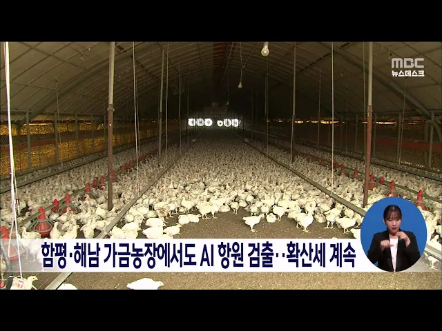 전남 가금농장을 중심으로 조류인플루엔자 확산이 계속되고 있습니다. 전라남도는 함평군의 산란계 농장과 해남군의 육용오리 농장에서 H5형 AI 항원이 검출돼 해당 농장에서 키우는 닭과 오리 9만여 마리를 살처분했다고 밝혔습니다. 고병원성 여부는 검사중인 가운데, 현재까지 전남에서 고병원성 AI가 확진된 가금농장...