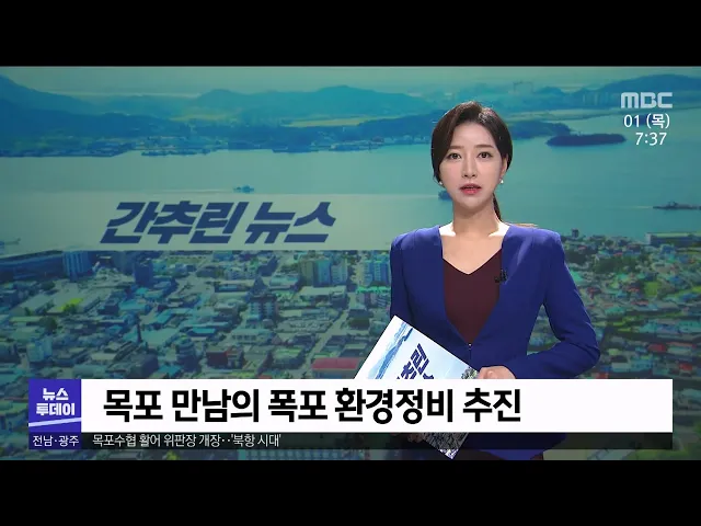 ◀ANC▶오늘의 간추린 뉴스입니다.목포시가부흥산 만남의 폭포 환경정비를 진행하고 있습니다.목포시는교통 통행량이 많고 목포의 관문이라고 할 수 있는'만남의 폭포' 경관 개선을 위해조형수목 가지치기와 함께 덩굴 제거작업을 진행하고침전물과 녹조를 제거하고 있습니다.------------2022 청년공동체 성과공유회에서...