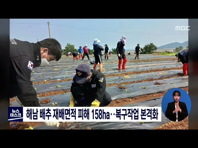 제11호 태풍 힌남노 피해를 입은 해남 겨울배추 재배면적이 158ha에 달하는 가운데, 추석 연휴를 앞두고 복구작업이 펼쳐지고 있습니다. 해남군 공직자와 완도해경 직원 등 백여명은 해남군 북평면과 산이면 등에서 배추 모종을 바로 세우는 등 피해복구 작업에 구슬땀을 흘렸습니다.