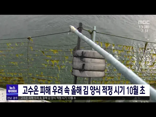 올해 바닷물 수온이 평년보다 0점5도가량 높은 가운데 국립수산과학원이 고수온 피해를 예방하기 위한 김 양식 시기를 예보했습니다. 수산과학원은 김망에 김의 씨를 붙이는 이른바 채묘 시기를 전남은 수온이 20도 이하로 떨어지는 10월 초로 전망했으며 진도는 이보다 보름 이른 9월 중순을 예보했습니다 . 지난해엔 신...