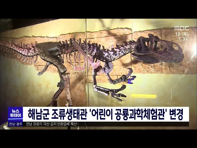 해남 우항리 공룡화석지 조류생태관에 과학기술부 공모사업으로 백악기 공룡 탐험을 주제로 한 '어린이 공룡과학체험관'이 들어섭니다. 해남 어린이 공룡과학체험관은 23개의 스토리로 구성될 예정이며 내년 3월 어린이 공룡과학체험관이 개관하면 전남 최초의 전문과학관이 될 전망입니다.