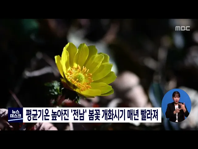 평년기온이 높아진 전남지역 봄꽃 개화시기가 매년 빨라지고 있습니다. 완도수목원이 지난 2009년부터 영암 월출산, 해남 두륜산 등에서 식물계절 모니터링을 실시한 결과 전남 봄꽃 개화 시기는 1년에 0.94일씩 빨라지고 잎이 떨어지는 가을철 낙엽 시기는 늦어지는 것으로 나타났습니다. 이는 기온의 영향이 가장 큰 것으...