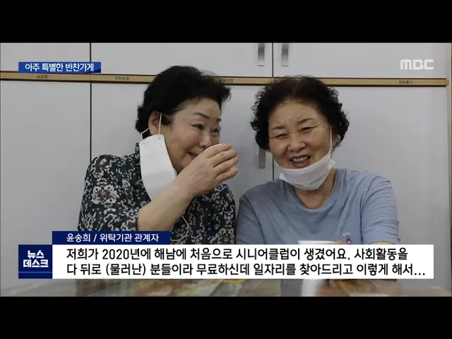 ◀ANC▶ 고령의 여성들이 함께 손맛을 통해 이웃사랑을 실천하고 있습니다. 해남 땅끝에 있는 아주 특별한 반찬가게를 박지혜 PD가 소개해드립니다. ◀END▶ 해남군 읍내 거리에 자리한 반찬가게. 일손을 거드는 이들 모두 60살을 넘긴 분들입니다. 말그대로 '시니어클럽'입니다. 지자체가 위탁업체를 정하고 가게를 빌...