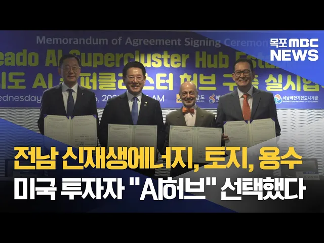 ◀ 앵 커 ▶미국을 순방 중인 김영록 전남지사 현지시간 오늘(26일) 미국 샌프란시스코에서 미국 투자회사인 퍼힐스와 세계 최대 규모의 'AI슈퍼클러스터허브구축'을 위한 MOA,합의각서 체결식을 가졌습니다.해남·영암 기업도시 구성지구에 미국과 중국을 뛰어넘는 'AI 허브'를 오는 2천30년까지 건설한다는 계획인데,실현여...