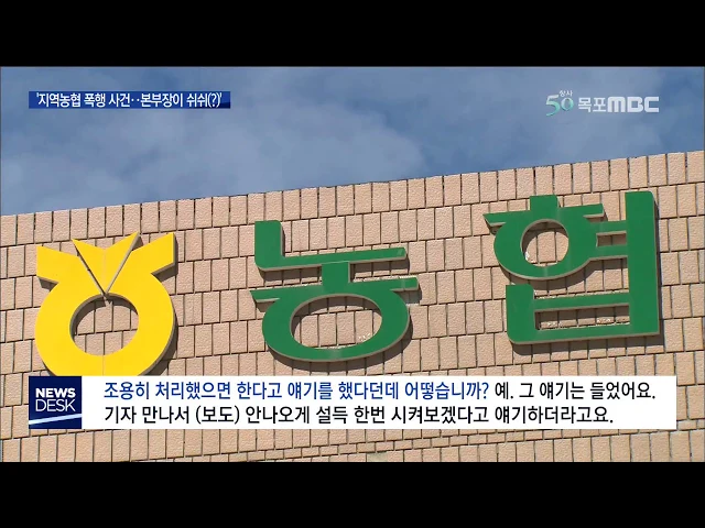 ◀ANC▶ 지역농협의 임원들이 농협 간부인 전무를 폭행한 사실이 뒤늦게 드러났습니다. 그런데 이 과정에서 관리 감독을 맡은 농협중앙회 전남지역본부의 본부장이 이 사실이 외부에 알려질까봐 직접 언론을 막겠다며 입단속에 나섰던 것으로 밝혀져 파문이 일고 있습니다. 박영훈 기자가 취재했습니다. ◀END▶ 해남의 ...