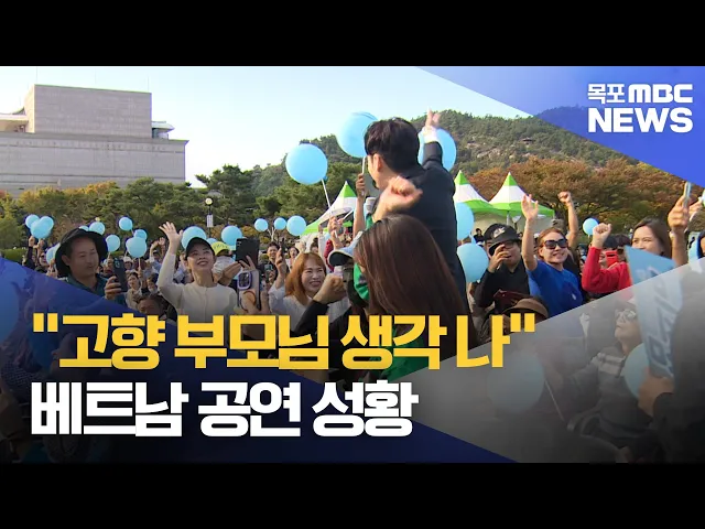 ◀ 앵 커 ▶베트남 이주민을 위한 위문공연이 어제(1) 목포에서 열렸는데요.베트남 정상급 가수들이 선보인 뜨겁고 감동적인 무대에 이주민을 포함한 관객 모두가 큰 호응을 보냈습니다.김규희 기자가 보도합니다.◀ 리포트 ▶베트남 국민 가수로 불리는 쾅 하가 목포에 떴습니다.경쾌한 리듬의 노래가 울려 퍼지자, 관객석에서...