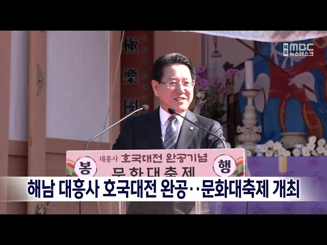 유네스코 세계문화유산으로 지정된해남 대흥사에서 호국대전 완공을 기념하는 문화대축제가 어제(2일) 열렸습니다.대한불교조계종 총무원장 스님과 정부 부처 인사 등이 참석한 가운데 진행된 행사에서는 추계 제향과 호국대전 현판 제막식 등이 이뤄졌습니다.2017년부터 설계가 진행돼 7년여 만에 완공된 호국대전은 779제...