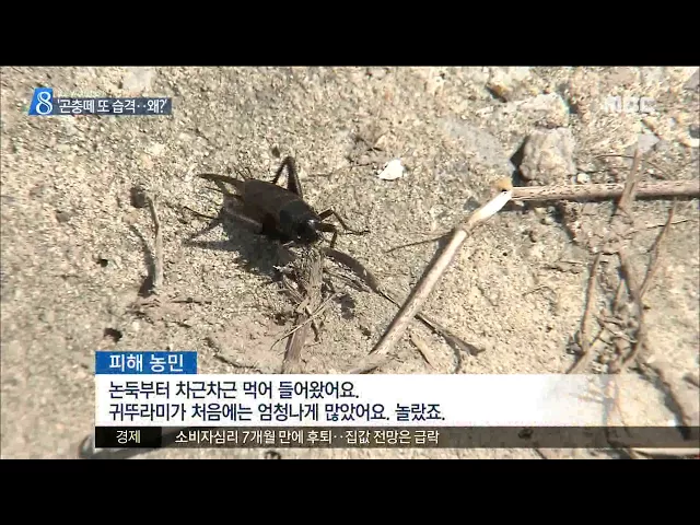 ◀ANC▶ 3년 전 매뚜기 종류인 '풀무치'떼가 나타나 큰 피해를 입었던 해남 간척지에서 올해는 귀뚜라미떼가 출현했습니다. 비상이 걸린 농사당국이 원인 조사를 해봤더니 결과는 뜻밖이었습니다. 박영훈 기자가 취재 ◀END▶ 해남의 대규모 간척 농경지입니다. 둑에 자란 풀을 헤치자 진한 흑갈색의 곤충들이 놀라 달아...