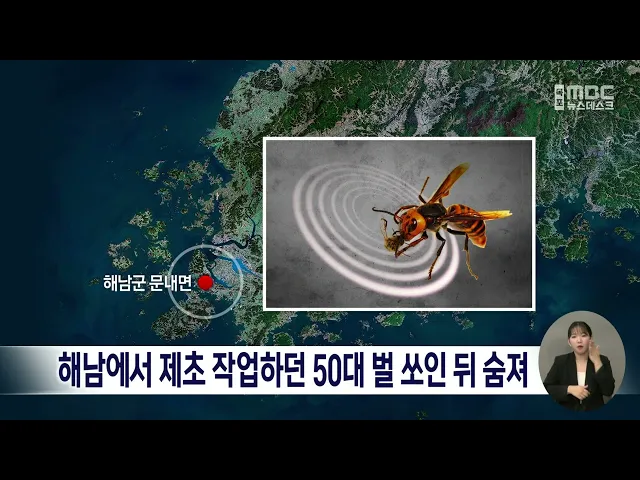 오늘(19) 오후 1시 20분쯤해남군 문내면의 한 폐교에서 제초 작업하던 50대 남성이 벌에 쏘여 병원으로 옮겨졌지만 숨졌습니다.경찰은 이 남성이 말벌에 쏘인 뒤호흡 곤란 증상을 보이다 숨진 것으로 보고 정확한 사인을 조사하기 위해국과수에 부검을 의뢰할 예정입니다.