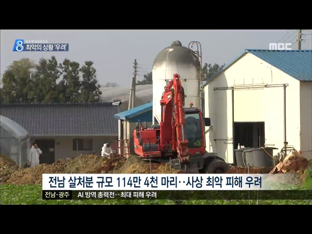 나주와 진도에서 발생한 조류인플루엔자도 고병원성으로 확진돼 지난 2천14년을 넘어서는 'AI 대란'이 우려됩니다. 현재 전남지역에서 발생한 AI는 나주 6건, 해남·무안·장성·구례·진도 1건씩 등 모두 11건으로, 모두 114만4000마리의 닭오리가 살처분 됐습니다. 이는 사상 최악의 피해로 기록된 지난 2014년 살처분 규모...