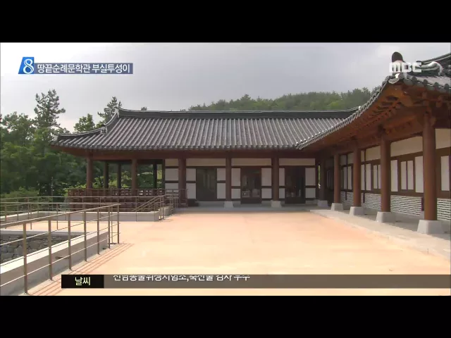 ◀ANC▶ 수십억 원의 혈세를 들여 지은 문학관이 준공한 지 수년째 개관하지 못하고 있습니다. 부실 시공 때문인데 하자보수마저 지자체의 관리 소홀로 차질을 빚고 있습니다. 문연철 기자가 보도합니다. ◀END▶ ◀INT▶ 2년 전 해남 고산 윤선도 유적지에 지은 땅끝순례문학관입니다. 옥상 바닥 곳곳에 땜질한 흔적들...