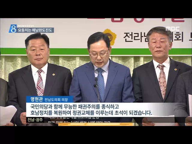 ◀ANC▶ 해남완도진도 선거구 일부 전남도의원들이 더불어민주당을 탈당하고 국민의당에 입당했습니다. 후보 단일화는 했지만 사퇴는 하지 않는 등 해남완도진도 선거구도가 급박하게 바뀌고 있습니다. 김양훈 기자가 취재했습니다. ◀END▶ 전남도의회 명현관 의장 등 도의원 4명이 국민의당에 전격 입당했습니다. 더민...