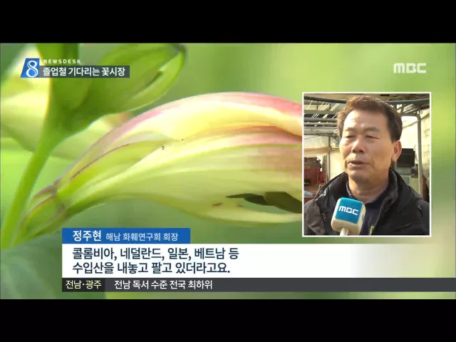 ◀ANC▶ 세월호 사고와 메르스 감염병 여파 등으로 최근 몇 년동안 꽃시장이 침체에 빠졌습니다. 졸업철을 앞두고 꽃 재배농가들이 대목을 기대하고 있습니다. 최진수 기자가 보도합니다. ◀END▶ ◀ANC▶ 연분홍의 루실, 자줏빛의 레노, 하얀 휘트니 등 10여 가지 품종의 꽃망울이 싱그럽게 피어납니다. 그러나 화훼재...