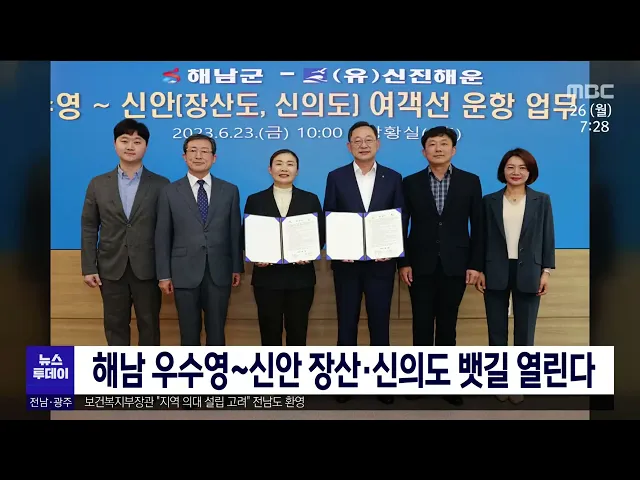 해남 우수영에서 신안 장산도와 신의도를 오가는 카페리 여객선이 취항합니다. 승객 314명과 차량 37대를 실을 수 있는 449톤급 카페리 여객선이 내일(26)부터 하루 3회 운항할 예정인 가운데 우수영에서 신의도까지는 1시간 10분 걸릴 것으로 예상됩니다. 또, 8월에는 신규 여객선이 추가 투입돼 해남 우수영과 신안 장산...
