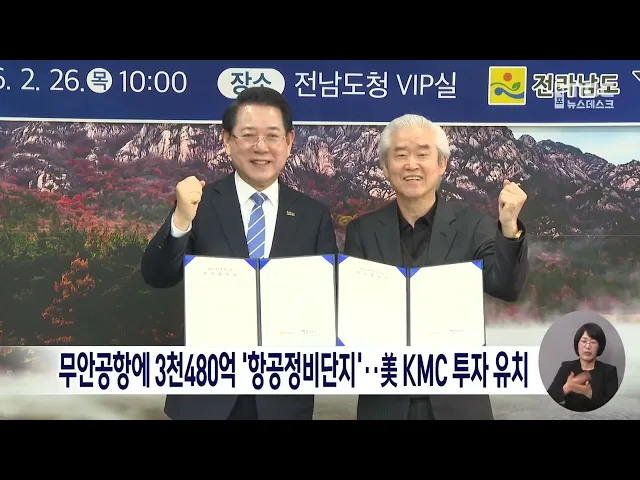 전라남도가 오늘(26일) 미국 항공 화물기 개조 기업인 KMC와3천480억 원 규모의 투자 협약을 맺었습니다.KMC는 오는 2028년까지 무안국제공항에 여객기를 화물기로 개조하는 조립 라인을 구축하고, 연간 10대의 대형 화물기를 생산할 계획입니다.이번 투자는 천여 명의 일자리 창출로 이어질 전망이고앞으로 민·군 통합 정...