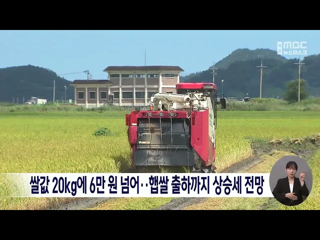 쌀값이 심리적 마지노선으로 여겨지는 20㎏당 6만 원을 넘어섰습니다.한국농수산식품유통공사에 따르면 어제(3일) 기준 쌀 20㎏ 소비자가격은 6만 316원으로 집계돼, 지난해 같은 시기보다 14%, 평년보다 12% 높았습니다.햅쌀이 본격적으로 수확되는 다음달까지 쌀값 상승세는 이어질 것으로 전망됩니다.한편 지난해 전국 ...