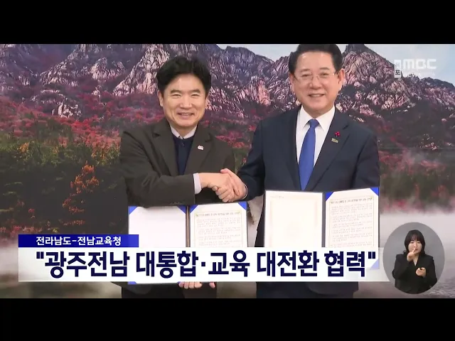 전라남도와 전남도교육청이광주전남 대통합과 교육 대전환을 위해적극 협력할 것을 공동 선언했습니다.김영록 전남지사와 김대중 전남교육감은오늘(8) 공동 선언문을 통해 통합특별시의 성공적 안착을 위해긴밀히 협력하는 한편 교육 분야와 관련된사항에 대해 특별법안을 작성하기로 했습니다.양 기관은 또 광주전남 행정...