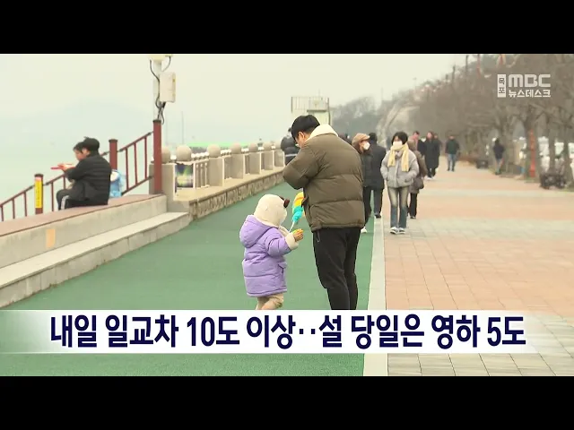 설 연휴 기간인 내일(16)은구름이 많다가 낮부터 차차 맑아지겠습니다.내일 아침 최저기온은영하 2도에서 영상 2도,낮 최고기온은 4도에서 13도로일교차가 10도 이상 크게 벌어지겠고,설 당일 아침 기온도 영하 5도까지 떨어져 춥겠습니다.기상청은 당분간 낮 동안 기온이 오르면서 강이나 저수지의 얼음이 얇아져 깨질 우...