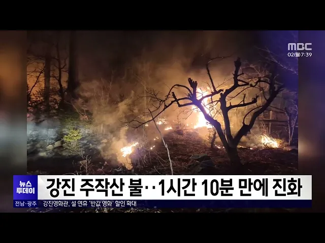 어제밤 9시쯤, 강진군 신전면의 주작산에서 불이 났습니다.산불은 1시간 10여 분 만에 꺼졌고,인명피해는 없는 것으로 파악됐습니다.산림당국은 자세한 화재 원인과피해규모를 조사하고 있습니다.