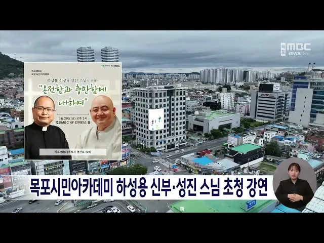 2025년 목포시민아카데미 첫 강좌가오늘 목포문화방송 4층에서 열렸습니다.강사로 나선 성진 스님은 자신의 부족함을 인정하고본바탕 그대로의 삶과 곁을 돌보는 온전한마음가짐이 필요하다고 말했습니다.또 하성용 신부는 충만함은 자신을 낮추고 비움으로서 상대방을 채우는 마음이라고 말하는 등 인생의 행복을 찾아가는...