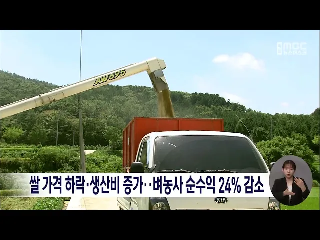 지난해 벼농사 농가의1000제곱미터당 순수익이 전년 대비 24% 감소해 30만 원에도 못 미치는 것으로 나타났습니다.통계청의 조사결과에 따르면지난해 벼농사 농가의 1000제곱미터당 총수입은115만 3천 원으로 총수입에서 생산비를 뺀순수익이 전년 대비 8만 7천 원 줄어든27만 1천 원으로 집계됐습니다.이는 산지 쌀 가격이...