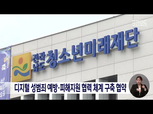 전남 디지털성범죄 지역특화상담소는도내 20개 시군 청소년상담복지센터,학교밖청소년지원센터와 함께 디지털 성범죄 피해지원을 위한업무협약을 체결했습니다.이번 협약을 통해 이들 기관은디지털 성범죄 피해 청소년 상담과심리 지원 강화, 피해 예방교육 확대,신속한 피해 접수와 대응체계 마련에협력하기로 했습니다.