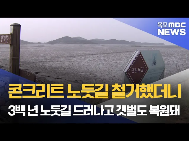 ◀ 앵 커 ▶ 갯벌을 가로지르던 콘크리트 노둣길이 걷어내자 놀라운 정도로 빠르게 갯벌 생태계가 복원되는장소가 있습니다. 신안군 암태와 추포 사이의 추포갯벌인데요,생태계 복원은 물론 3백년 넘은 노둣길도 다시 드러나고 있습니다. 김 윤 기자가 취재했습니다.◀ 리포트 ▶ 지난 2천21년 완공된 신안군 암태도와 추포도를...