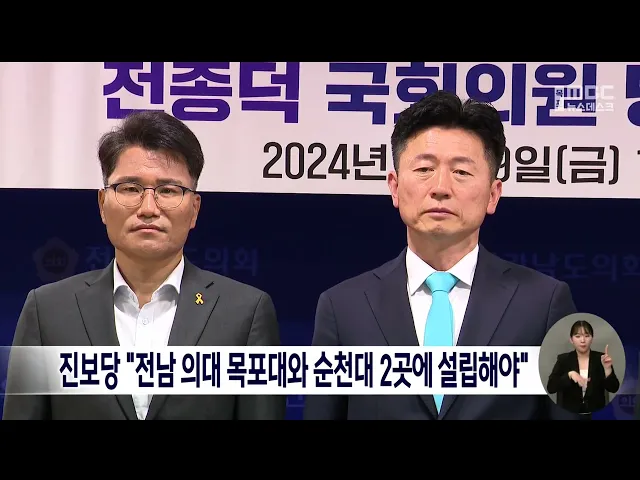 진보당 전남도당은오늘 전남도의회에서 기자회견을 열고목포대와 순천대 2곳에 전남 의과대학 설립을촉구했습니다.진보당 전남도당은목포대와 순천대에 의대가 함께 설립되어야도민 요구가 실현되는 것이지 어느 한쪽만된다면 반쪽은 여전히 도민의 과제로 남을 수밖에 없다며 전남에 2개 의대가 설립되도록도민의 힘과 정...