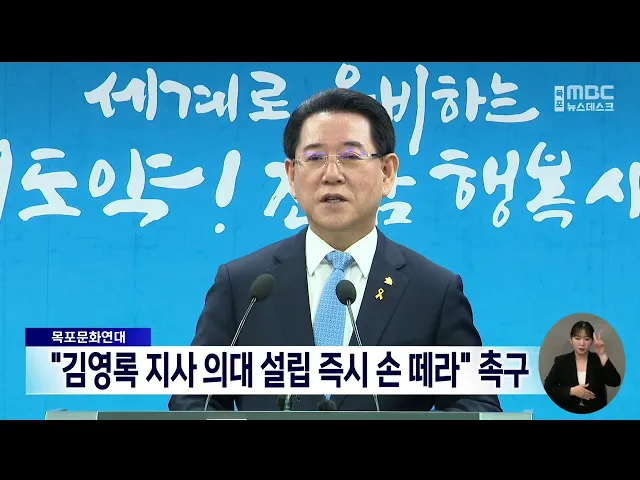 목포문화연대는 오늘(18일) 보도자료를 통해"김영록 전남지사가 전남권 의과대 설립과 관련해 공모방식을 즉각 중단하고 손을 떼고 목포대 의과대를 설립하라"고 주장했습니다. 문화연대는 또,전남지사가 뜬금없이 공모방식을 제시한 것과 관련해 지난 3월 21일 대통령실을 방문해 당시 누구를 만나 무슨 합의를 하였는지 ...