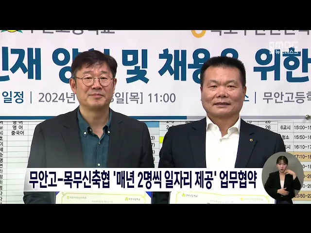 무안고와 목포무안신안축협은 오늘(18일) 업무협약을 맺고, 무안고 졸업예정자 가운데 매년 2명 내외의 기능직원을 채용하기로 했습니다. 협약에 따라 무안고는 선취업 후진학 희망 학생을 모집해 축협의 맞춤형 인재를 양성하고, 이 가운데 적격자를 매년 2명 내외로 기능직으로 채용한 뒤 정규직 전환 기회를 제공할 예...